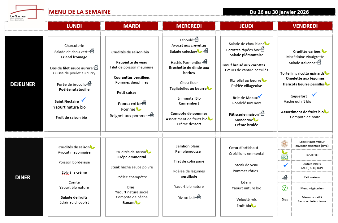 Menu du self du 26 au 30 janvier 2026