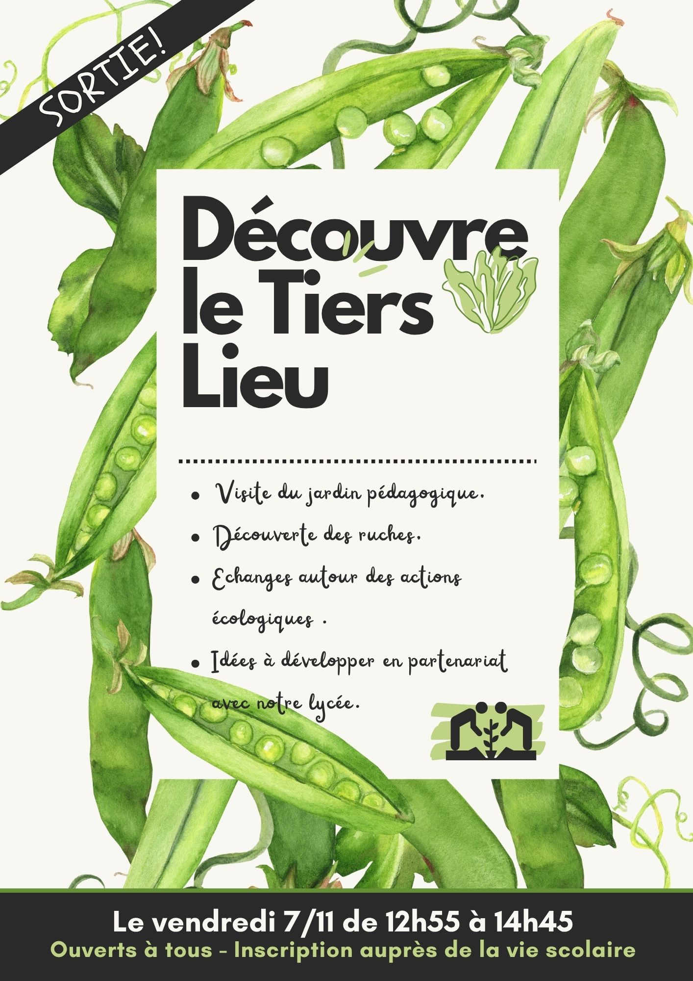 Le vendredi 07/11/2025 de 13h00 à 15h00, viens découvrir le Tiers-Lieu du 4 Bis, un espace ouvert à la nature, à la créativité et aux projets collaboratifs. Inscriptions ouvertes à tous auprès de la vie scolaire.