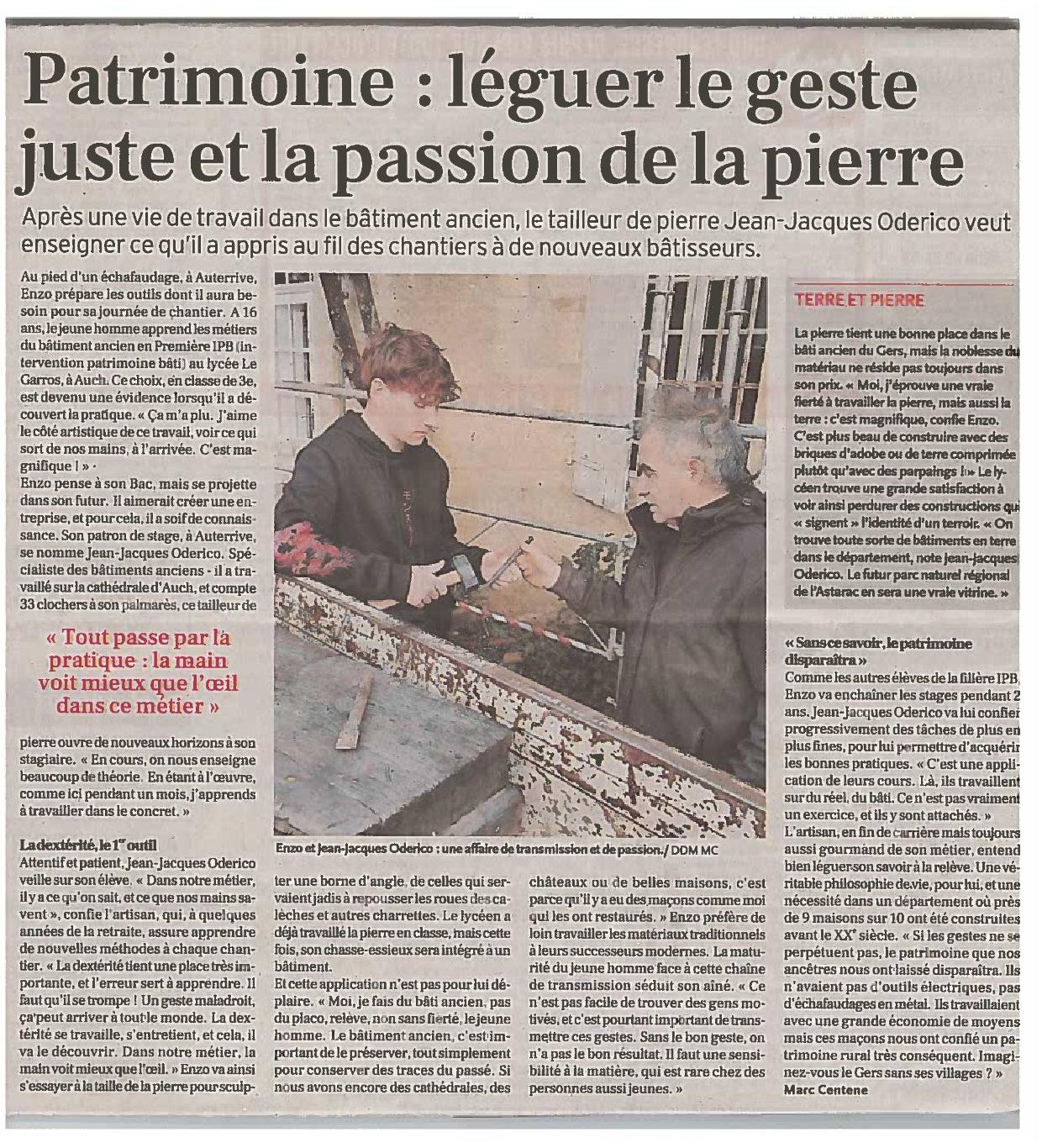 Enzo, élève en 1ère Intervention sur le Patrimoine Bâti (IPB) à l'honneur, avec son Maître de Stage, dans La Dépêche du 30 Novembre 2023